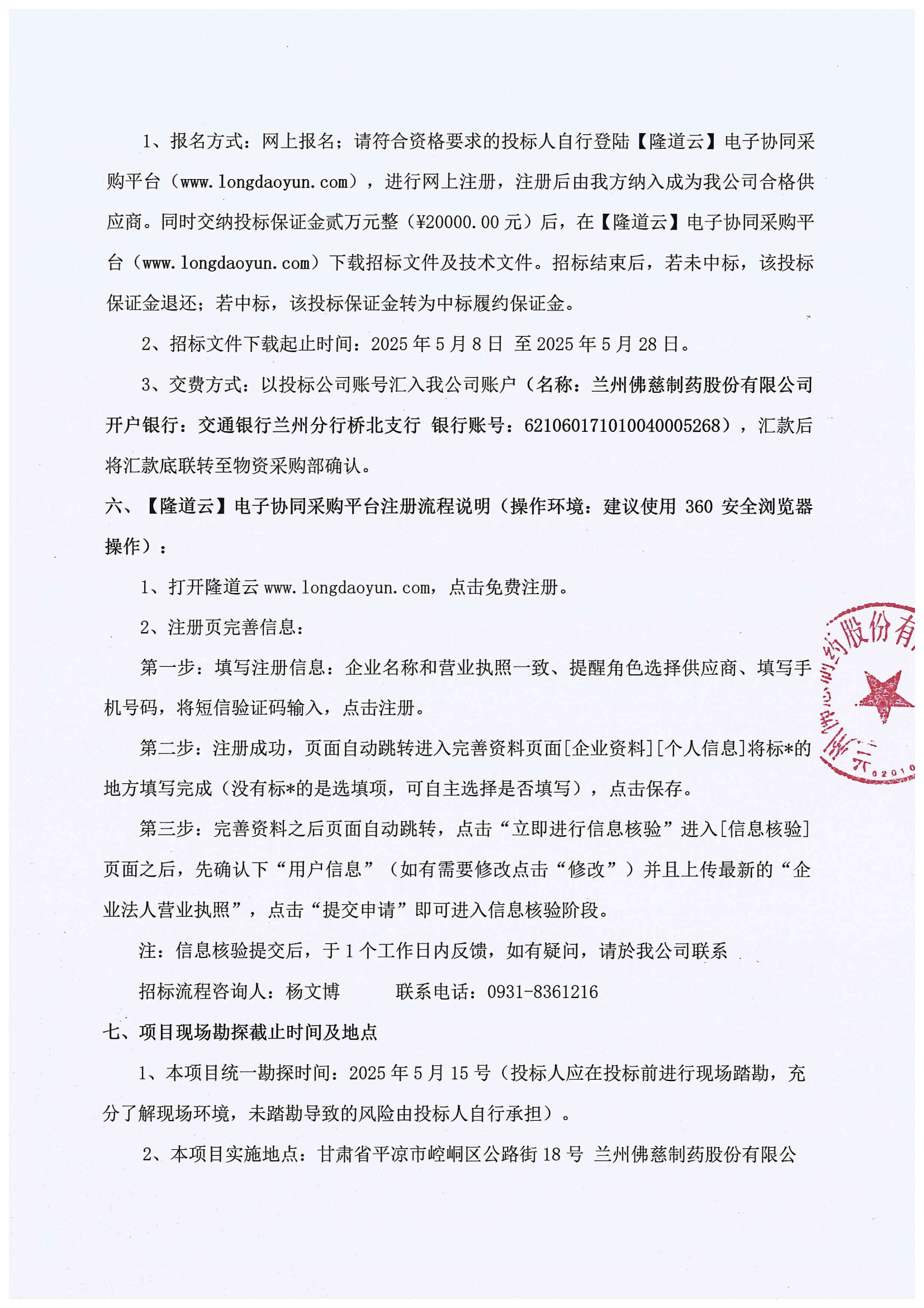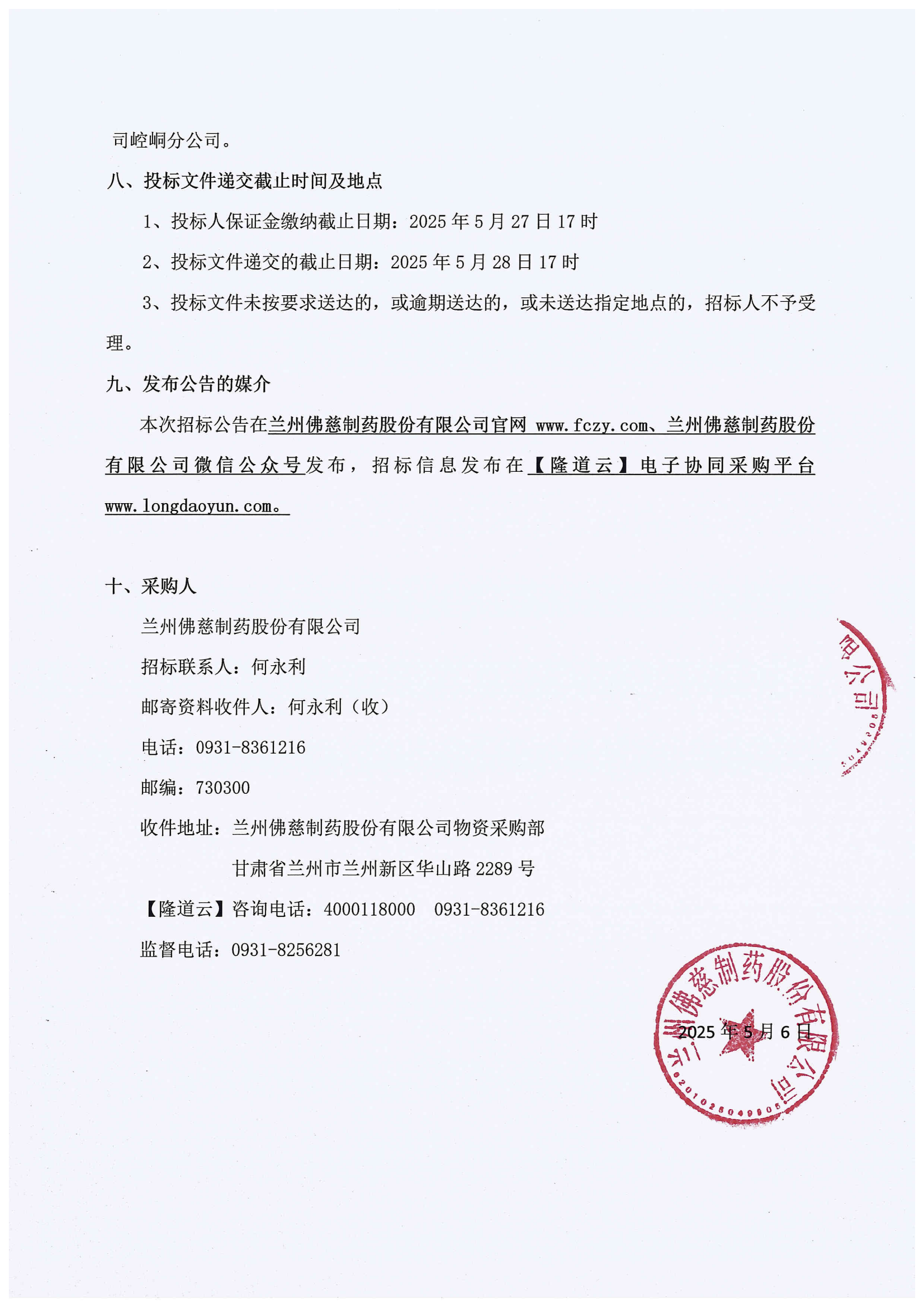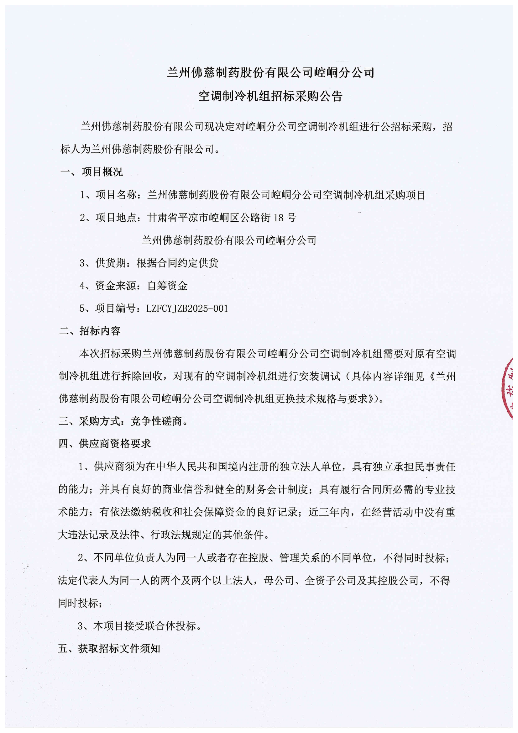 兰州佛慈制药股份有限公司崆峒分公司空调制冷机组招标采购公告