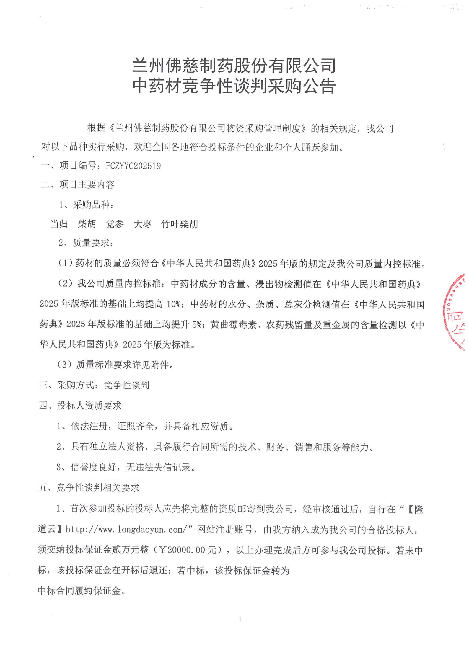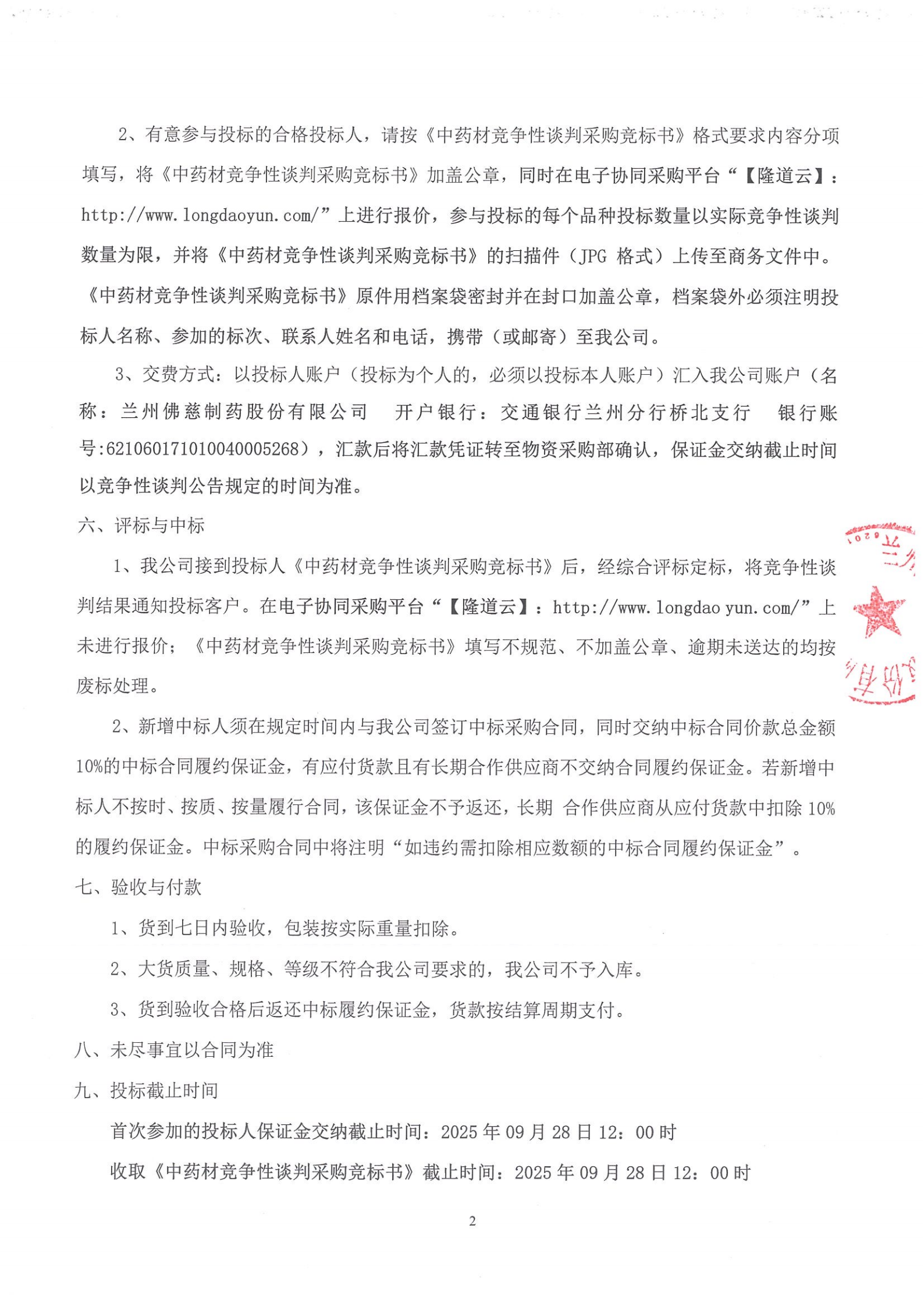兰州佛慈制药股份有限公司中药材竞争性谈判采购公告