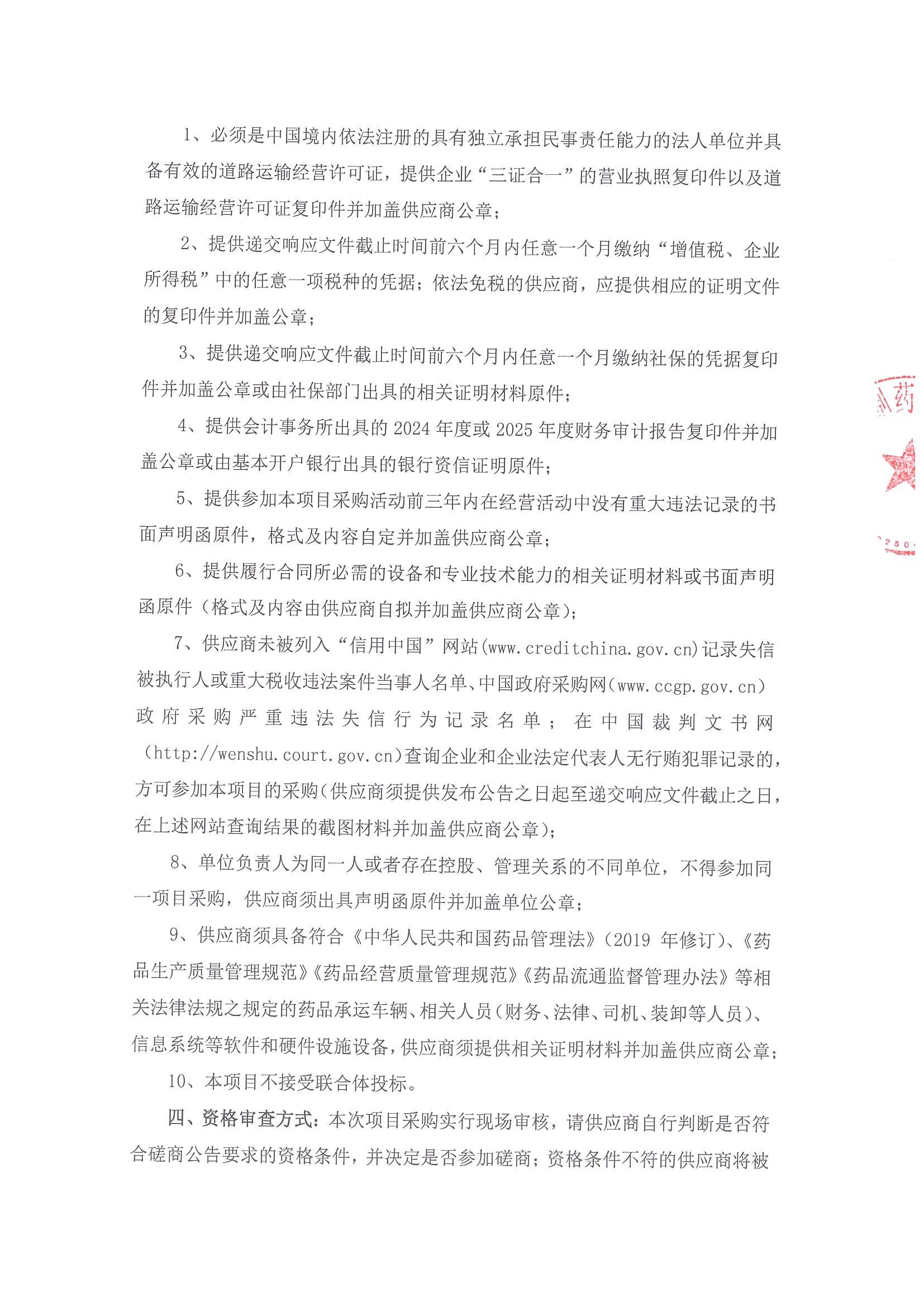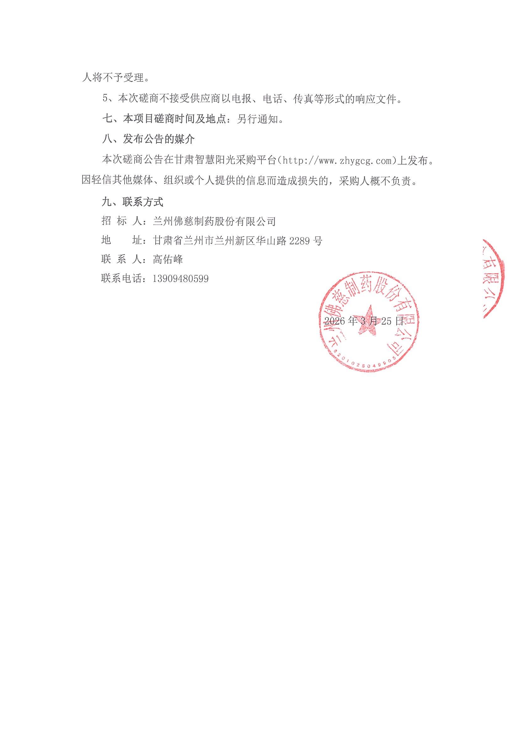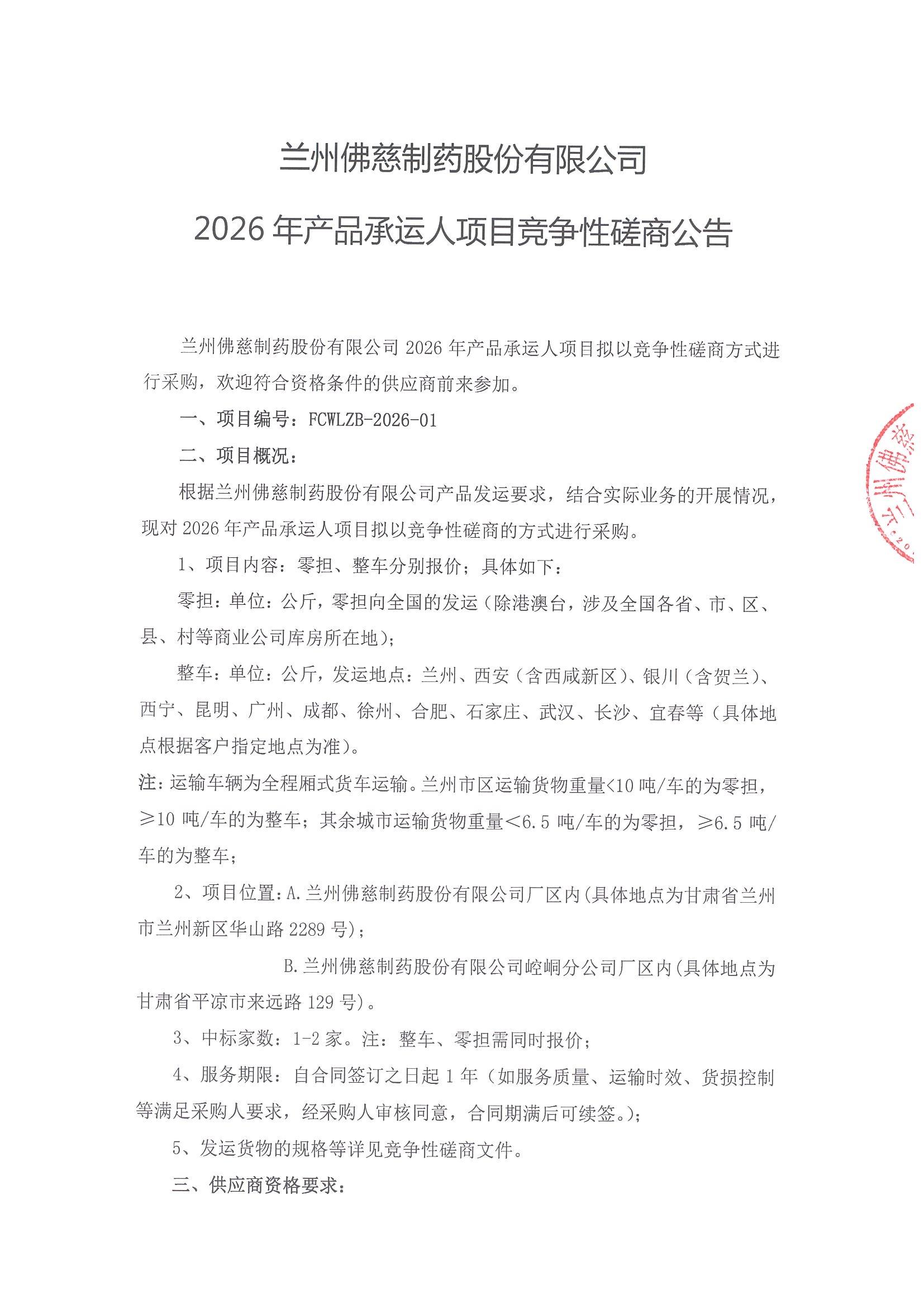 兰州佛慈制药股份有限公司2026年产品承运人项目竞争性磋商公告