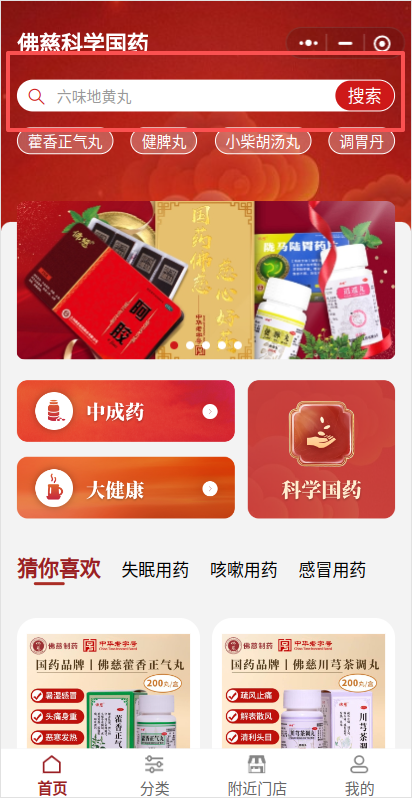 第一步:在搜索框输入产品名称“六味地黄丸”,点击搜索。